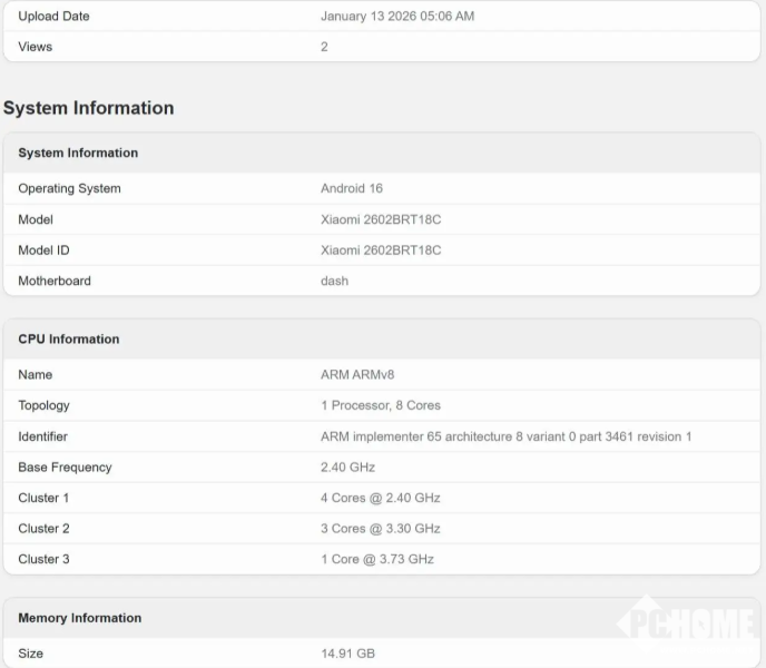 此次曝光的跑分数据显示,Redmi Turbo 5 Pro内存容量达16GB(显示为 14.91GB),搭载的天玑9500e芯片采用全大核设计——1颗3.73GHz超大核、3颗3.30GHz大核与4颗2.40GHz小核,GPU型号为Immortalis-G925 MC12。