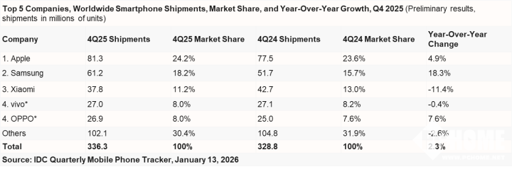 此外,小米、vivo 和 OPPO 在2025年整体保持了相对稳定的市场地位,但份额略有下滑,小米全年仍稳居全球第三。