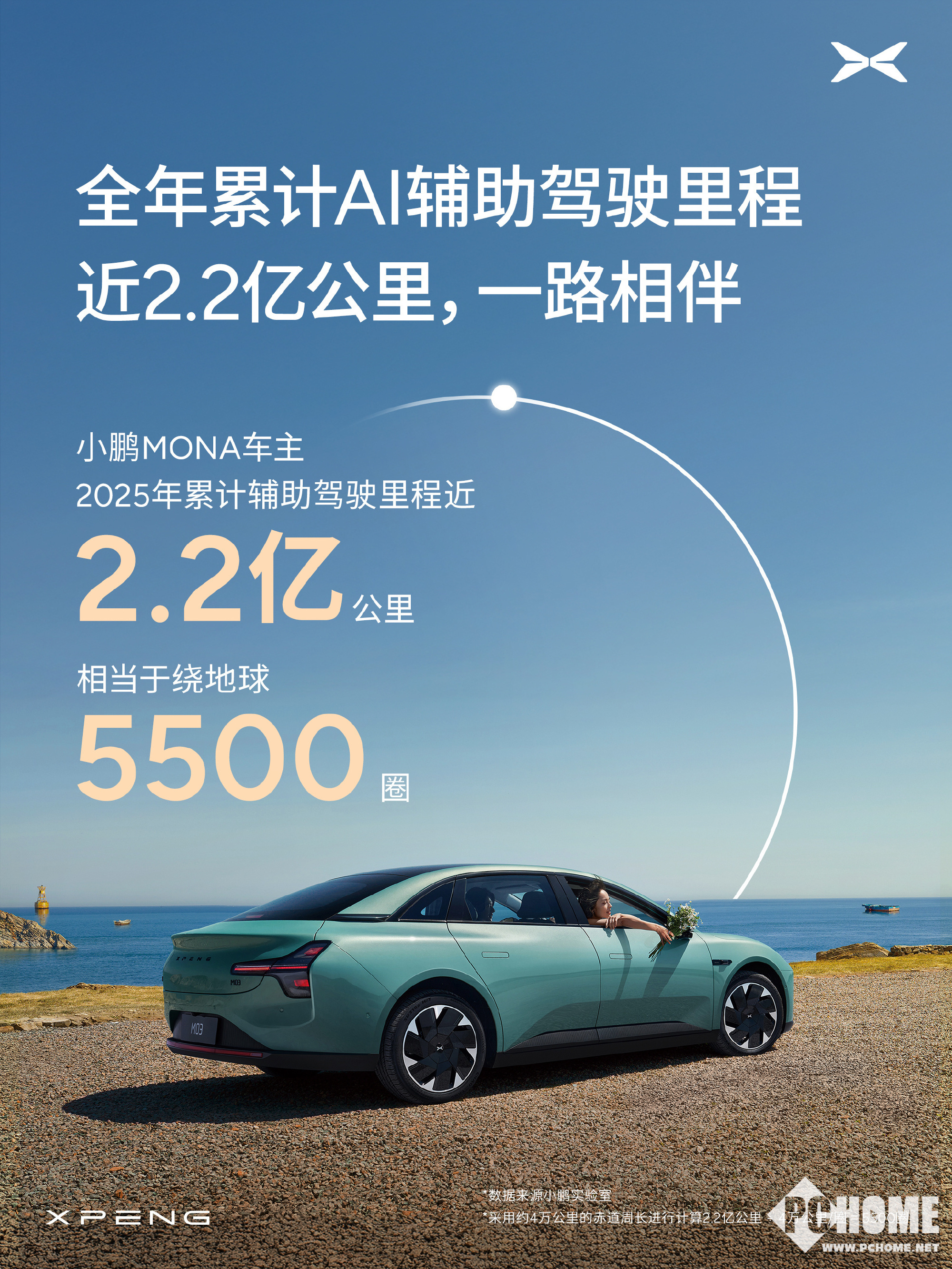 1月14日消息,小鹏汽车官方微博今日发布小鹏MONA年度AI辅助驾驶报告。报告显示,2025年小鹏MONA车型AI辅助驾驶累计里程近2.2亿公里,相当于绕地球5500圈。