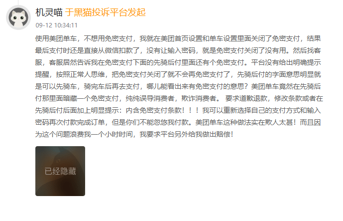 此前就有消费者吐槽,美团骑车的“先骑后付”功能暗藏免密支付条款,关闭独立免密支付后仍会被自动扣款,直到扣款信息才知情;在支付宝小程序购买了哈罗单车30天畅骑卡,却被客服告知只能在哈啰APP使用。