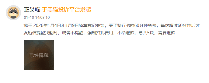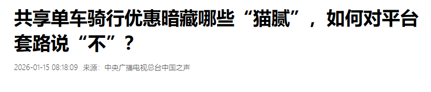 2026年1月15日,中央广播电视总台中国之声发文报道了部分共享单车随意扣费的乱象。