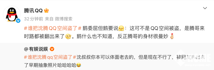 腾讯QQ官微发文称,鹅委屈但鹅要说:“这可不是QQ空间被盗,是腾哥来时路都被翻出来了。鹅什么也不知道,反正腾哥的身材很曼妙。”