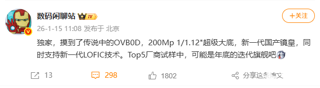2026年1月15日,博主“数码闲聊站”爆料了国内影像传感器巨头豪威集团新一代旗舰传感器OVB0D的配置——200Mp超高像素与1/1.12英寸超级大底,被誉为“新一代国产镜皇”。