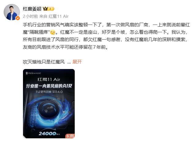 1月15日消息,红魔游戏手机产品总经理姜超今日微博发文表示:手机行业的营销风气确实该整顿一下了,第一次做风扇的厂商一上来就说前辈红魔“隔靴搔痒”。并认为所有目前跟进了风扇的同行都欠红魔一句感谢,没有红魔前几年的深耕和摸索,友商的风扇技术水平可能还停留在7年前。