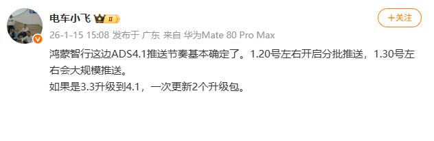 2026年1月15日消息,博主“电车小飞”发文爆料称,鸿蒙智行车系搭载的华为乾崑智驾ADS 4.1版本基本确定推送节奏,将于1月20日左右开启分批推送,1月30日左右会大规模推送。