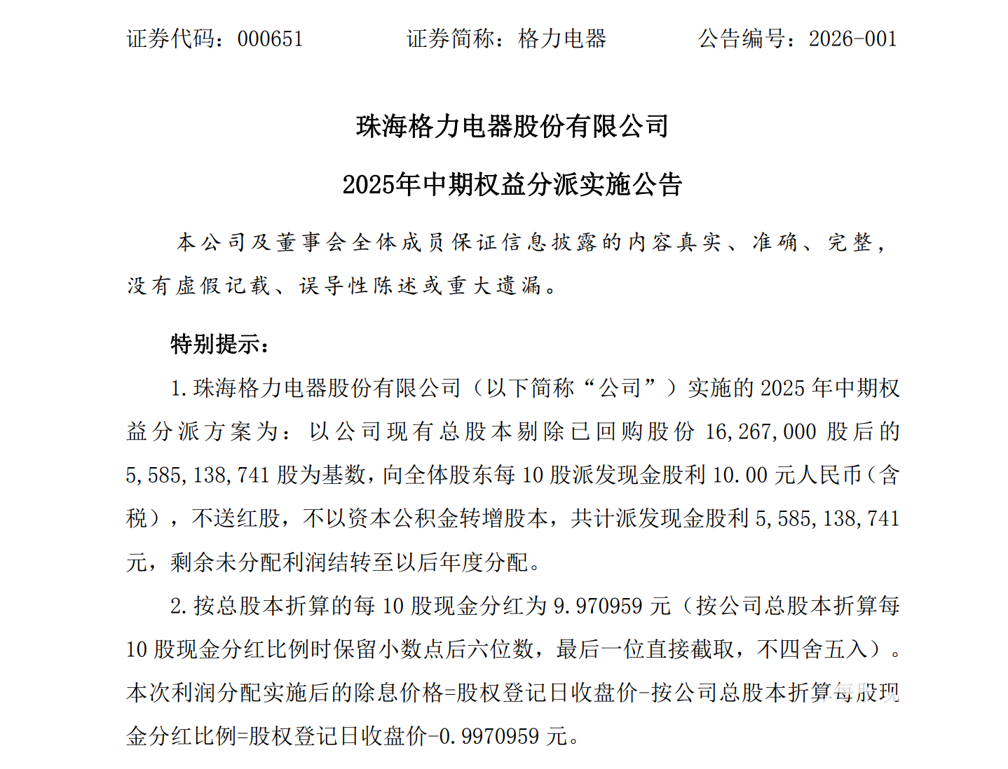 2026年1月15日晚,格力电器披露2025年中期权益分派实施公告,宣布派发55.85亿元现金股利,折合56亿元,占公司上半年净利润的39%。