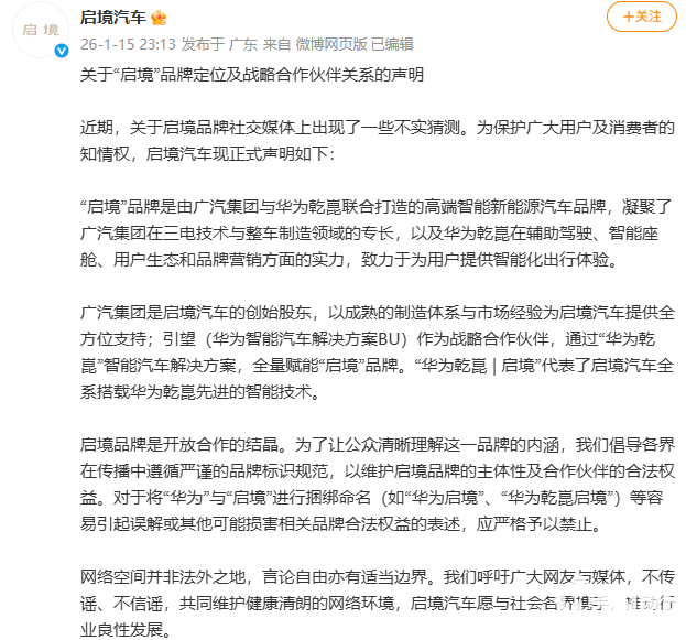 2026年1月15日晚,广汽集团与华为乾崑联合打造的高端智能新能源汽车品牌启境汽车,在微博发布正式声明,明确禁止将“华为”与“启境”进行捆绑命名,包括“华为启境”“华为乾崑启境”等易引发误解的表述,强调需维护启境品牌主体性及合作伙伴合法权益。