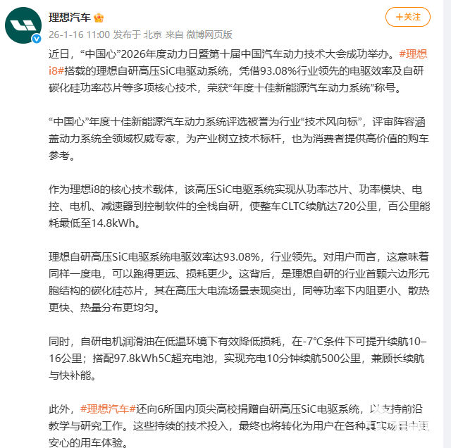 2026年1月16日,理想汽车今日发文称,近日在“中国心”2026年度动力日暨第十届中国汽车动力技术大会上,理想i8搭载的理想自研高压SiC电驱动系统,凭借93.08%行业领先的电驱效率及自研碳化硅功率芯片等多项核心技术,荣获“年度十佳新能源汽车动力系统”称号。