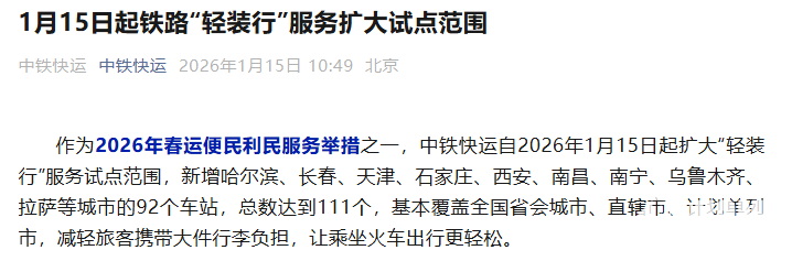 2026年1月16日消息,据中铁快运公众号发文,中铁快运自2026年1月15日起扩大“轻装行”服务试点范围,新增92个车站,总数达到111个,基本实现省会城市、直辖市、计划单列市全覆盖。