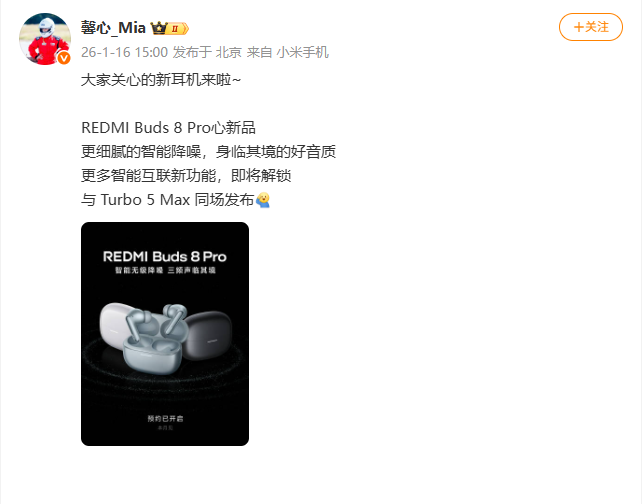这款宣传标语为“智能无级降噪三频声临其境”的产品将于本月与REDMI Turbo 5 Max手机同场发布。目前预约活动已全面启动,用户可通过小米商城、京东等官方平台提前锁定名额。