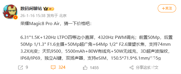2026年1月16日,博主“数码闲聊站”曝光了荣耀Magic8 Pro Air的主要参数。