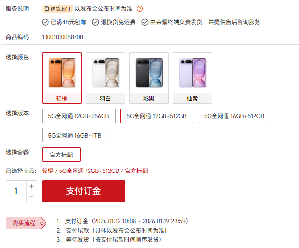 目前该机已在荣耀官网开启预订,提供12GB+256GB至16GB+1TB多种存储版本选择,预计起售价在4000-4500元区间。具体售价将于1月19日19:30举办的专场发布会中进一步披露。