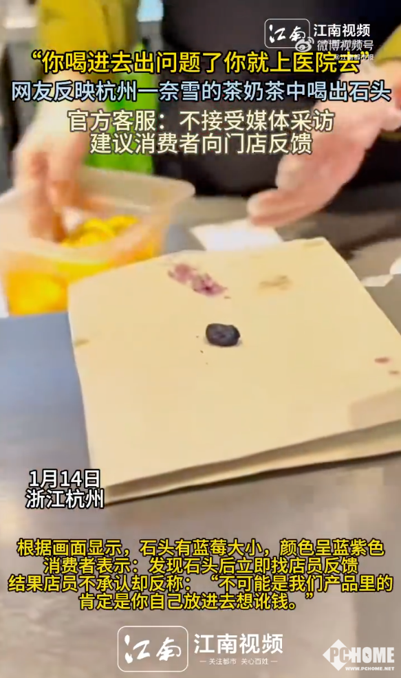 2026年1月16日,《江南都市报》报道称,有网友在社交平台表示,自己于1月14日晚在奈雪的茶杭州临平区万达广场店购买的“66颗蓝莓桑葚奶昔”内喝出了一个石头。