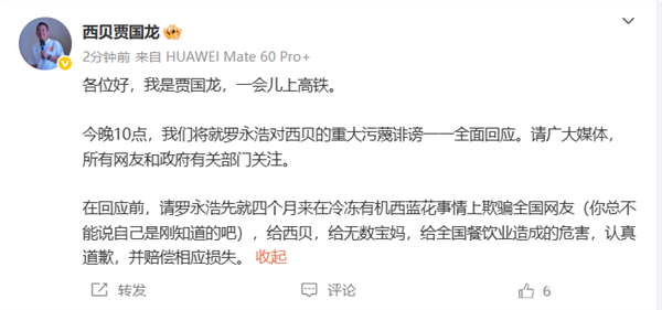 2026年1月16日,西贝餐饮创始人贾国龙在微博发文,今晚10点将就罗永浩对西贝的“重大污蔑诽谤”进行全面回应,呼吁媒体、网友及政府相关部门关注。