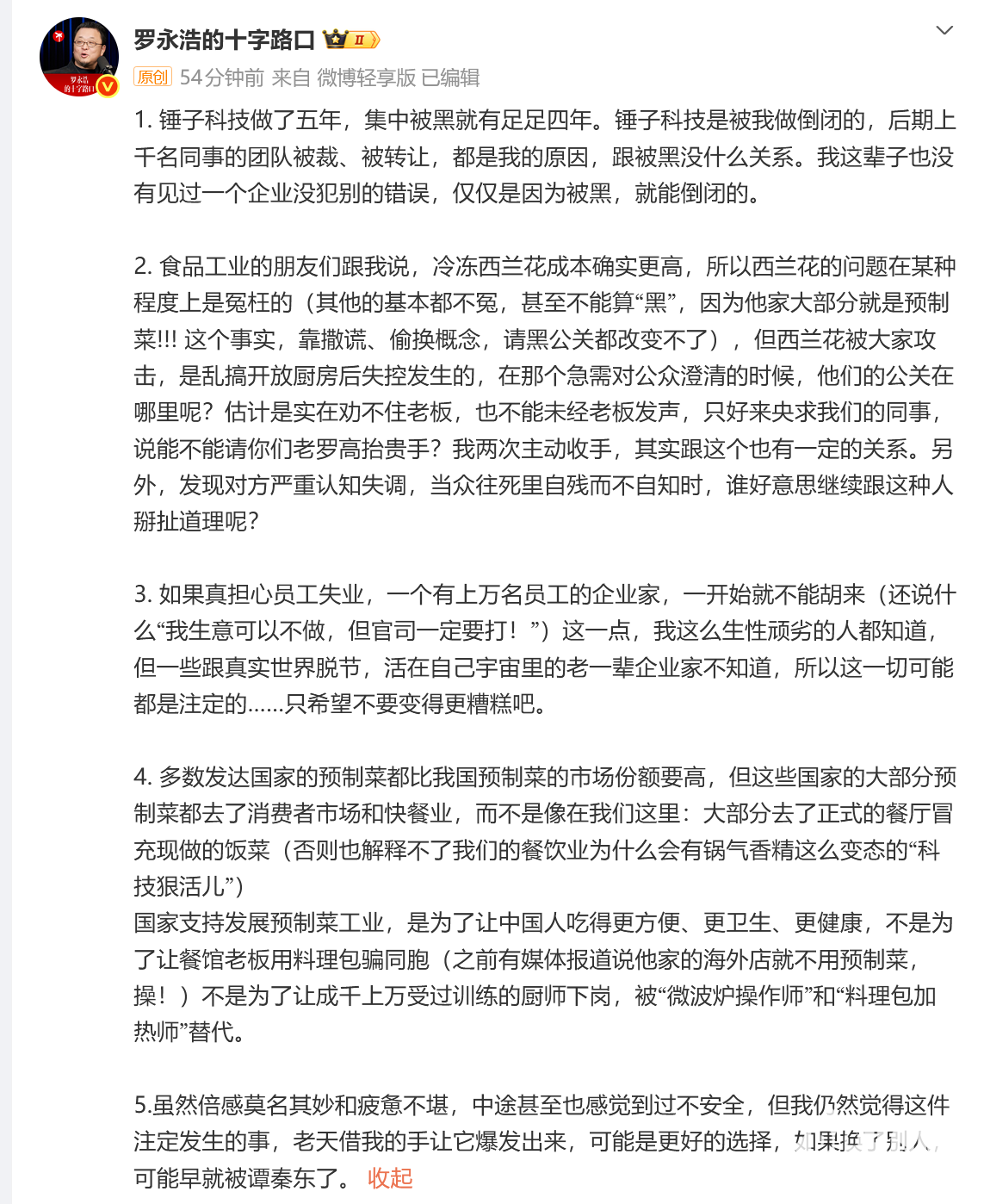 贾国龙在文中明确要求罗永浩应该认真道歉并赔偿损失,直指其四个月以来在“冷冻有机西蓝花”事件上“欺骗全国网友”,给西贝品牌、无数宝妈群体及全国餐饮业造成了实质性危害。