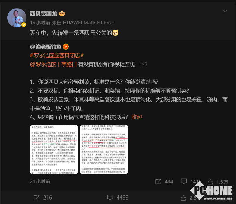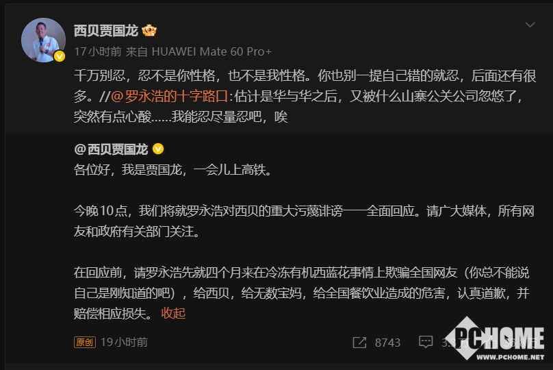 据了解,罗永浩于昨日下午发微博称:没见过一家企业仅仅因为被“黑”就倒闭的。矛头直指西贝关店归因于舆论的说法,贾国龙回应称晚间直播逐条反驳罗永浩的“污蔑诽谤”,同时希望各大媒体关注。消息爆出后,微博站方认定二人策划公开互驳的行为属于“组织网上论战骂战”,违反社区公约,对其二人实施禁言。