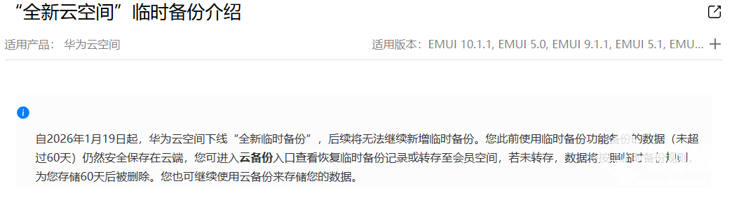 2026年1月19日,华为官方宣布旗下云空间“全新临时备份”功能今日起正式下线,用户后续将无法继续新增临时备份。
