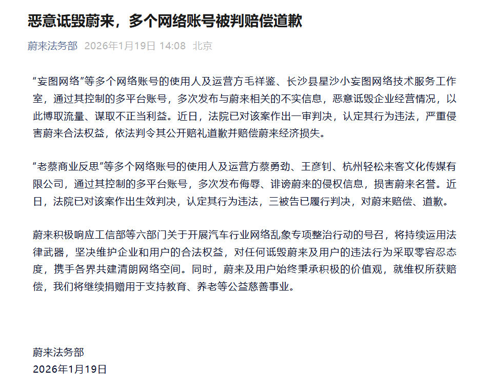 2026年1月19日,蔚来法务部正式公布最新维权进展,“妄图网络”“老蔡商业反思”等多个网络账号及相关运营主体,因发布侮辱、诽谤性言论或不实信息诋毁蔚来品牌,被法院依法判决公开赔礼道歉并赔偿经济损失。蔚来明确表示,所有维权所得赔偿款项将全额捐赠,用于教育、养老等公益慈善事业,持续践行企业社会责任。