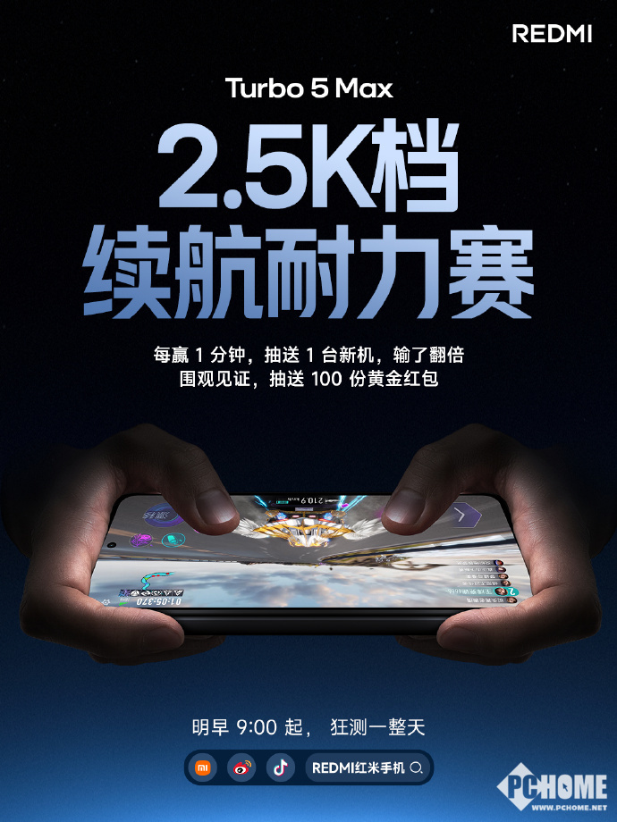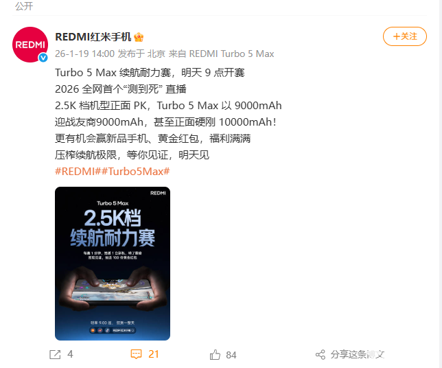 2026年1月19日,小米官方正式官宣明天九点将举行REDMI Turbo 5 Max续航挑战赛“测到死”直播。