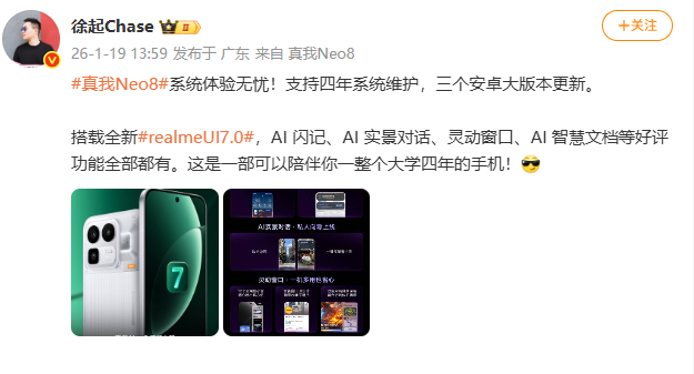 2026年1月19日,真我realme副总裁、全球营销总裁、中国区总裁徐起宣布,即将发布的真我Neo8手机将提供四年系统维护,三个安卓大版本更新。