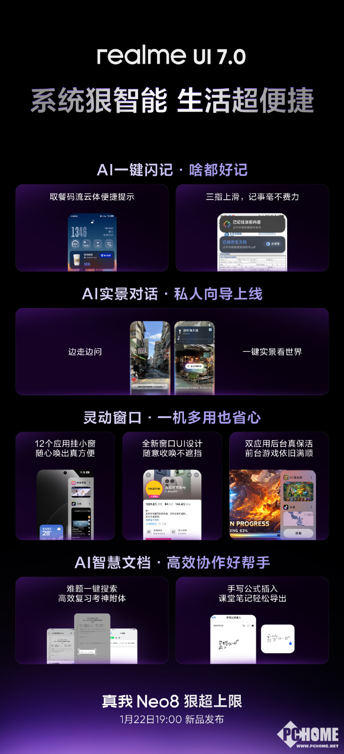 据介绍,realme真我Neo8预装realme UI 7.0系统,安卓大版本更新将带来AI功能升级,包括支持AI闪记、AI实景对话、灵动窗口、AI智慧文档等功能;四年持续维护可有效延缓硬件老化带来的卡顿问题,宣称是“可以陪伴一整个大学四年”的手机。