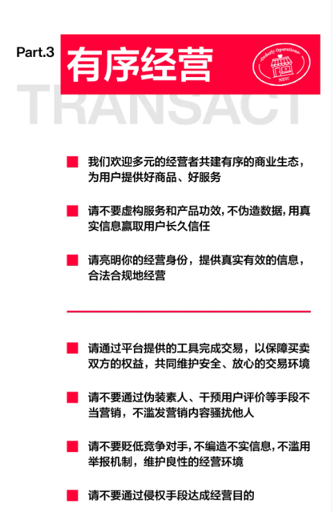 随着买家、个体商家、新兴品牌等商业角色的不断涌入,小红书商业生态日益繁荣,新增的“有序经营”板块专门针对违规营销、恶意竞争、伪造口碑等行为提出了明确反对,为合规经营者营造公平环境。