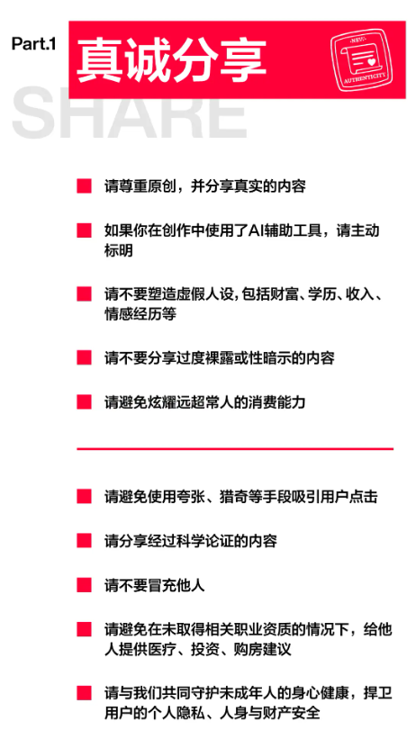 在“真诚分享”板块,公约针对AI创作类的问题,明确要求“使用AI辅助工具创作需主动标明”,同时严禁塑造虚假人设,包括虚构财富、学历、情感经历等内容,有效维护了社区的真实性。