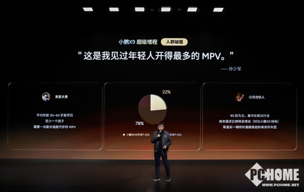 2026年1月19日,小鹏汽车正式发布小鹏X9超级增程版用户画像报告,数据显示该车女性用户占比高达22%,是传统MPV行业平均值(约5%)的5倍。同时,90后车主占比达57.2%、00后占比13.7%,远高于行业平均值。