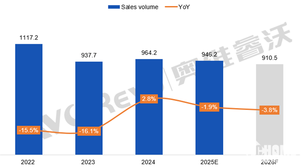 2026年1月19日消息,受内存(DRAM)与硬盘(NAND Flash)价格持续暴涨影响,中国笔记本线上市场正遭遇涨价潮+需求疲软的双重冲击。奥维睿沃(AVC Revo)最新预测显示,2026年中国笔记本线上零售销量预计仅为910.5万台,较2025年的946.2万台同比下跌3.8%,将创下近5年来的销量新低。