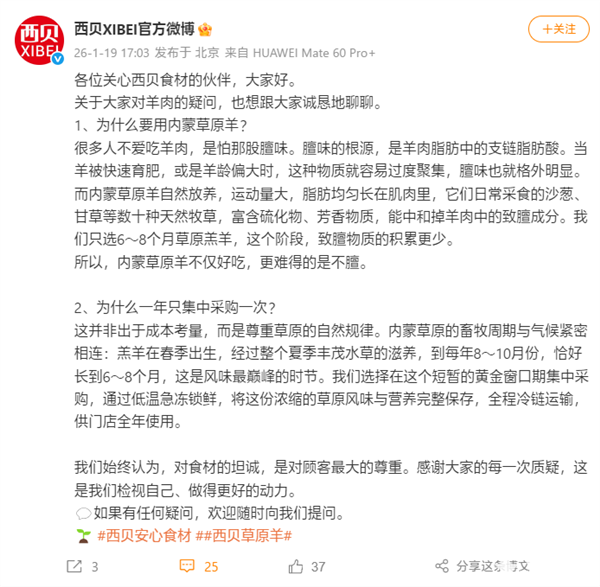 2026年1月19日,西贝餐饮针对“羊肉一年仅集中采购一次”的广泛讨论首次作出正式回应,明确这一采购模式并非单纯成本考量,而是遵循内蒙古草原羊的自然生长规律。