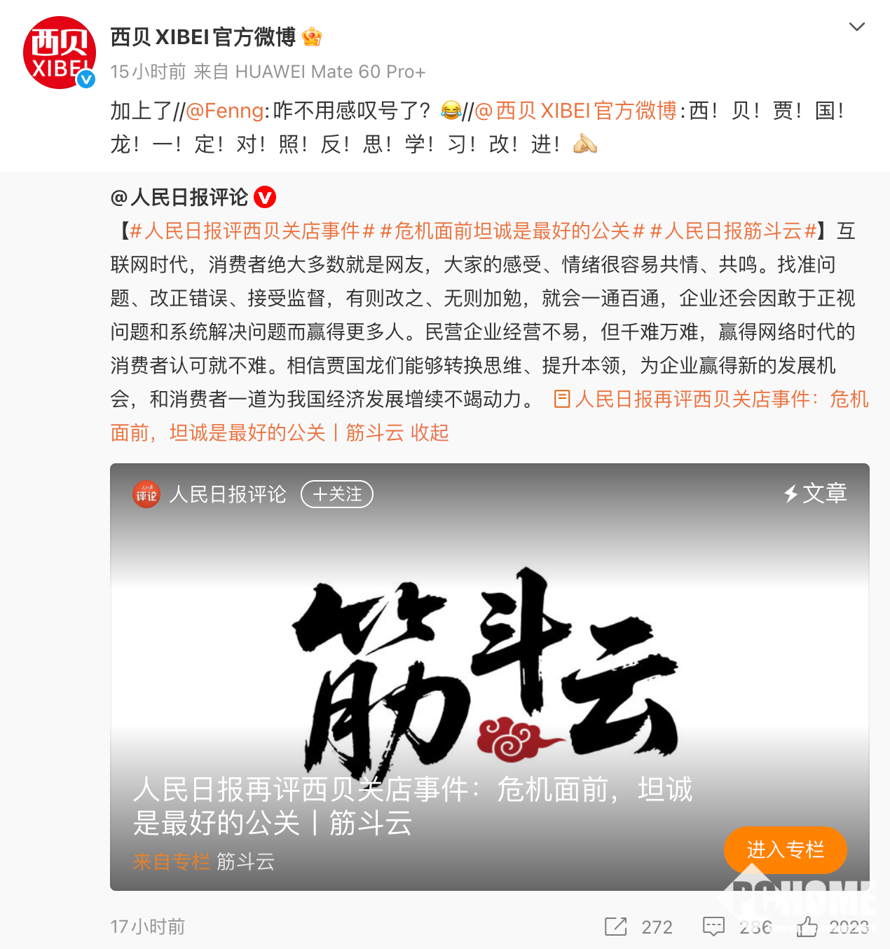 近日,针对西贝事件再次发酵,《人民日报》发布名为《危机面前,坦诚是最好的公关》的评论文章表示,互联网时代,消费者绝大多数就是网友,大家的感受、情绪很容易共情、共鸣。找准问题、改正错误、接受监督,有则改之、无则加勉,就会一通百通,企业还会因敢于正视问题和系统解决问题而赢得更多人。