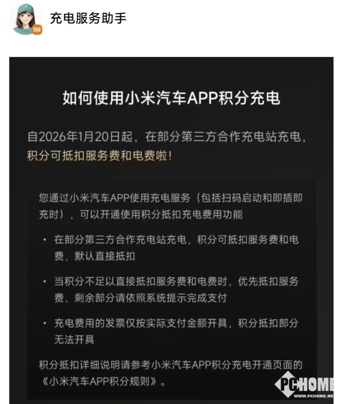 2026年1月20日,小米汽车官方宣布积分充电服务正式升级,车主通过小米汽车App使用充电服务时,积分可同时抵扣电费与服务费。