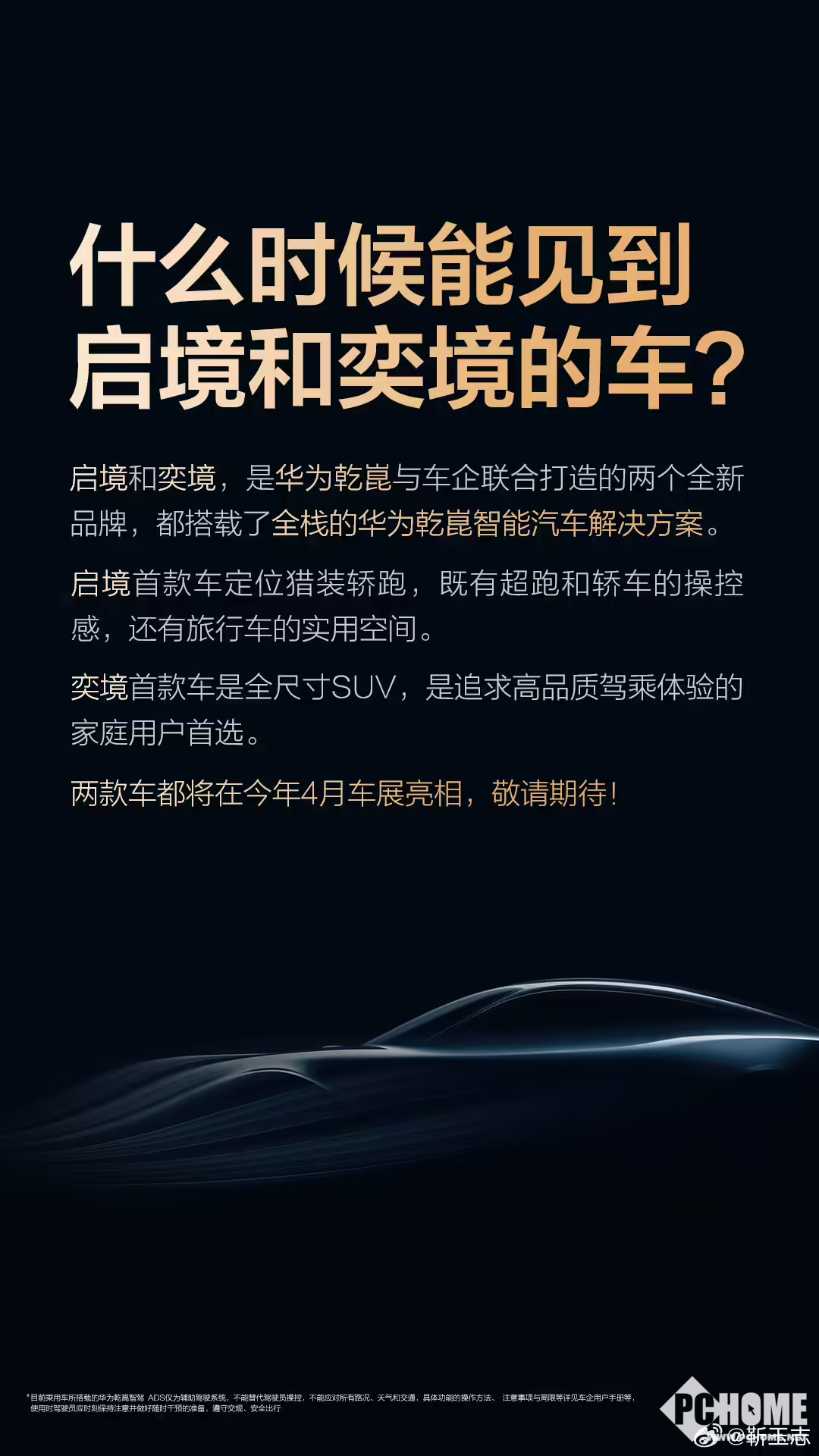 据介绍,启境品牌Slogan是“Make Difference”,首款车定位猎装轿跑;奕境则聚焦家庭出行,践行“Light Your Life”,首款车是全尺寸SUV,搭载很多华为乾崑新功能。