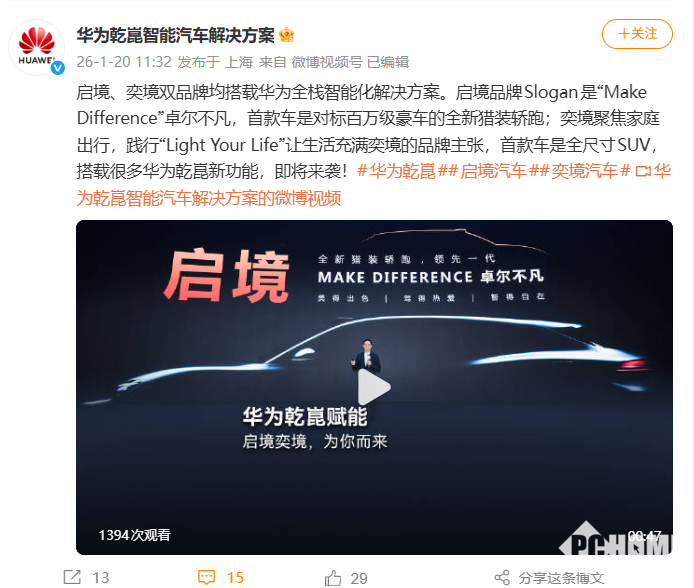 2026年1月20日,华为乾崑智能汽车解决方案发布视频,分享了华为智能汽车解决方案BU CEO靳玉志在近期行业沟通会上的发言。