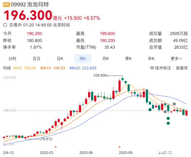 据了解,自2025年8月29日触及339.8港元的高点后,泡泡玛特股价开启持续下行通道,截至2026年1月19日收盘报180.8港元,累计跌幅超43%,市值从超4000亿港元缩水至约2428亿港元。2026年1月16日,其股价大跌6.8%至176.4港元,创2025年5月以来8个月新低。下跌主因是核心IP“LABUBU”热度退潮,二手市场价格大幅跳水,叠加投资者对其增长可持续性的担忧。不过1月19日公司斥资2.51亿港元回购140万股股份,1月20日股价应声大涨,盘中涨幅超10%,报199.6港元/股。