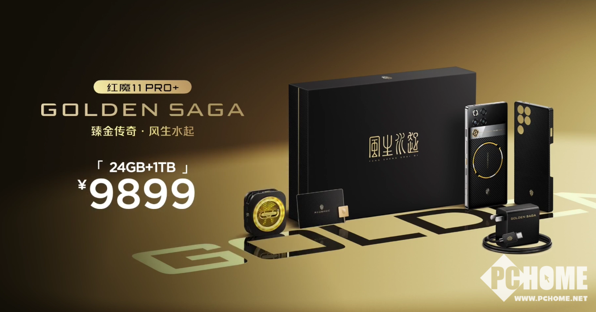 红魔11 Pro+ GOLDEN SAGA“臻金传奇·风生水起”限量典藏版手机今日正式开售,搭载24GB+1TB存储空间,售价9899元。