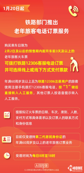 2026年1月21日,据中国铁路消息,1月20日起,铁路部门正式推出老年旅客电话订票服务,年满60周岁及以上、持第二代居民身份证的旅客,可直接拨打12306客服电话订购火车票,支持线上或线下两种付款方式,进一步方便老年旅客购票出行。