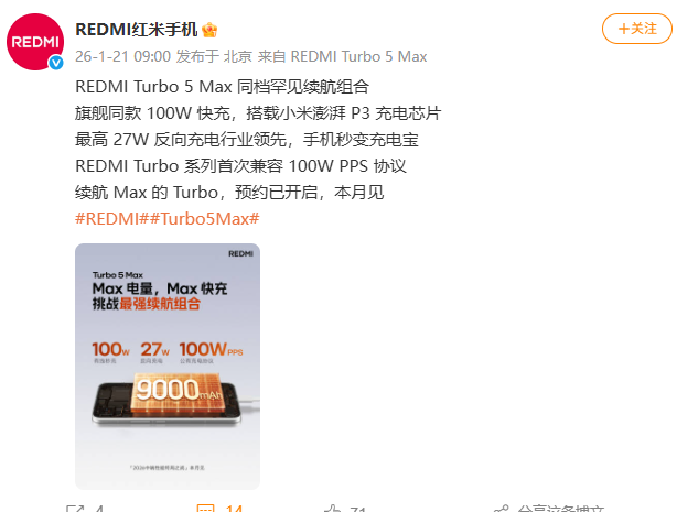 2026年1月21日,REDMI红米手机官方正式官宣REDMI Turbo 5 Max将配备同档罕见续航组合:新机搭载100W有线快充与27W反向充电功能、系列首次兼容100W PPS通用快充协议、搭配9000mAh超大容量硅碳负极电池。
