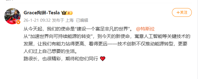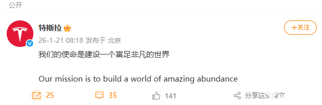 2026年1月21日,特斯拉官方微博正式宣布更新企业使命,表述为“我们的使命是建设一个富足非凡的世界”(Our mission is to build a world of amazing abundance)。