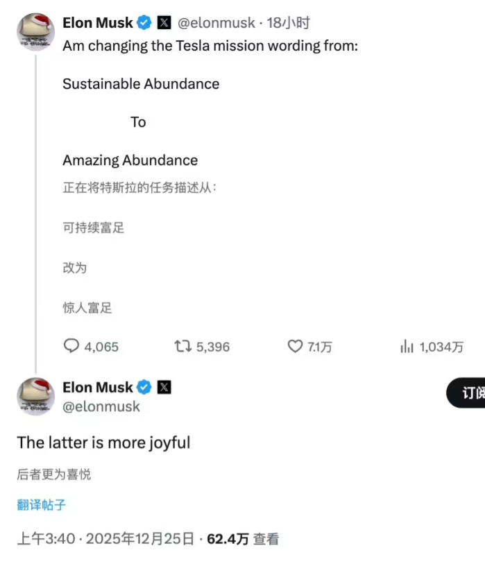 特斯拉初期以“加速世界向可持续能源的转变”为使命,推动电动汽车与清洁能源领域的技术普及;2025年9月发布《宏图计划第四篇章》后,使命升级为“可持续的富足”,强调通过技术融合加速全球繁荣;2025年12月,马斯克通过X平台发文称,计划将特斯拉的使命“可持续的富足”调整为“惊人的富足”,并解释称新的表述更具愉悦感。