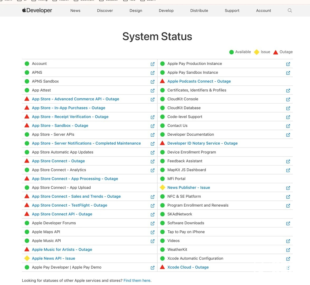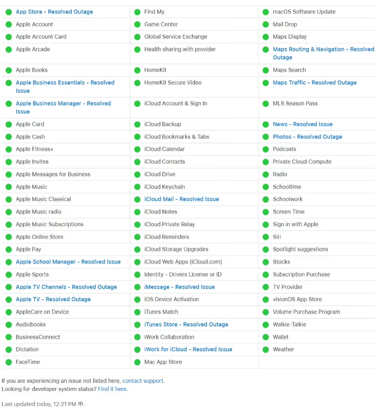 2026年1月21日,苹果系统状态页面更新故障通报,确认App Store、Apple TV、iTunes商店在内的多项苹果服务出现持续性中断,部分用户还遭遇照片应用、iMessage及iCloud版iWork功能异常。
