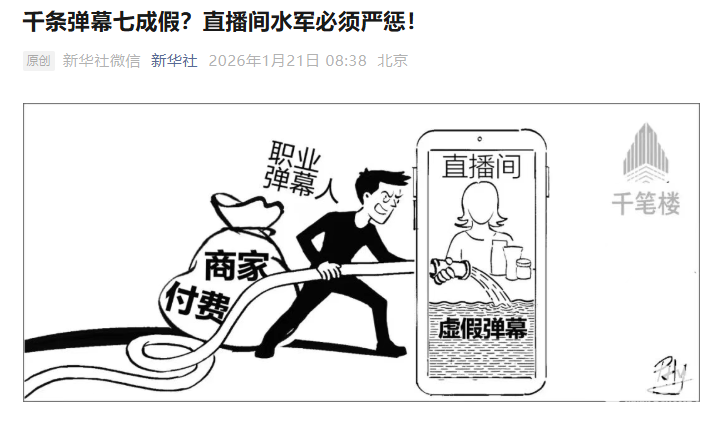 2026年1月21日,新华社发文报道了直播电商领域“职业弹幕人”黑灰产乱象,部分直播间通过操控网络账号或者雇佣网络水军,在直播、短视频等互动场景中发送虚假弹幕从而虚构口碑,以达到伪造热度、诱导消费的目的。