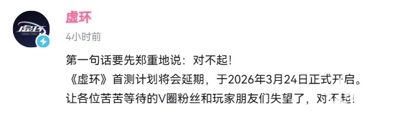 2026年1月21日消息,腾讯旗下V圈主题手游《虚环》因内部测试版本质量问题未达预期,昨日官方宣布将原定今年1月的首测推迟至3月24日开启,并通过公开内部测试反馈清单向玩家致歉。