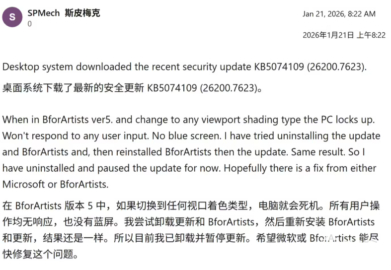 2026年1月21日,科技媒体NeoWin报道称,Windows 11用户安装微软1月累积更新之后,除了导致3D创作软件BforArtists卡死外,还造成薪资管理与远程访问应用在登录后闪退。