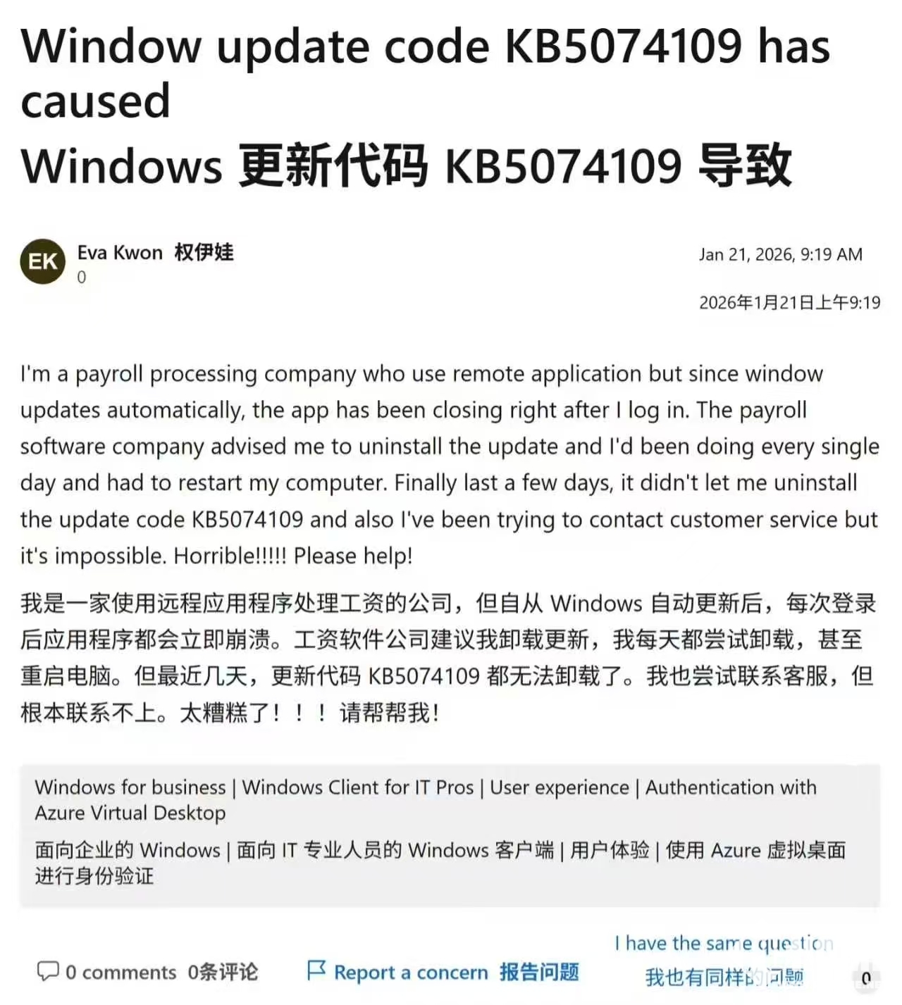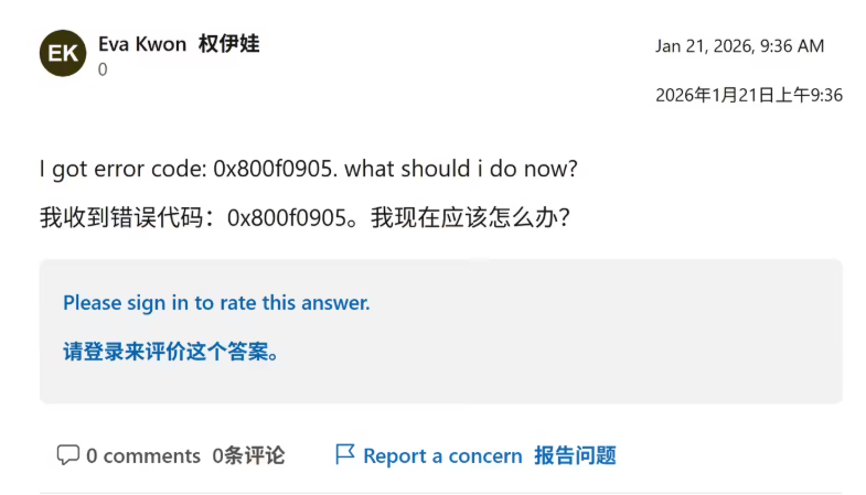 更令用户困扰的是故障修复受阻。不少用户尝试通过系统设置或安全模式卸载KB5074109更新,但均被“0x800f0905”错误提示拦截,无法通过回滚操作恢复正常使用。尽管微软已在1月17日发布紧急补丁,修复了部分设备无法关机、远程桌面连接失败等问题,但薪资管理应用闪退、Outlook崩溃、游戏帧率暴跌等核心故障仍未得到解决。