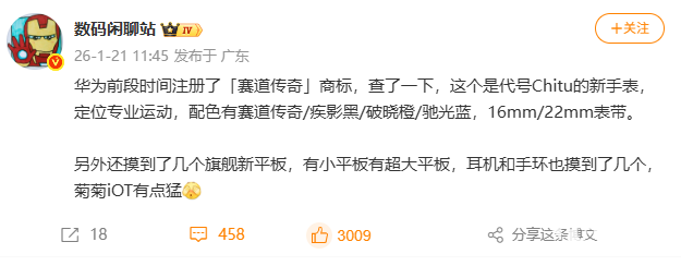 2026年1月21日,数码博主“数码闲聊站”爆料,华为此前申请注册的“赛道传奇”商标,其对应产品为代号“Chitu(赤兔)”的全新专业运动手表。