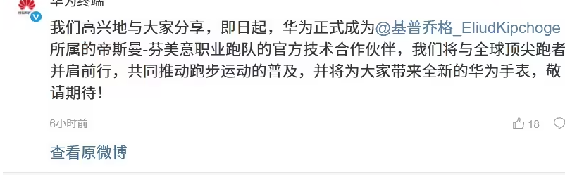 此外,在2026年1月6日,基普乔格所属的帝斯曼-芬美意职业跑队正式与华为终端达成战略合作,华为终端BG首席营销官黄翮明确表示,双方并非简单代言合作,而是基于顶尖运动员训练数据的技术共创。基普乔格在合作官宣视频中佩戴的华为智能手表,被推测正是“赛道传奇”的原型机。