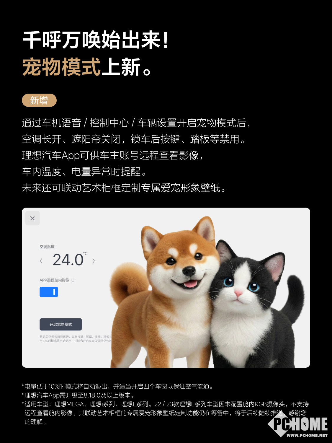 值得注意的是,宠物功能也全面上新,车主通过车机语音/控制中心/车辆设置开启宠物模式后,将禁用空调长开、遮阳帘关闭,锁车后按键、踏板等。还可通过理想汽车App远程查看影像,车内温度、电量异常时可及时提醒,未来还将联动艺术相框定制专属宠物形象壁纸。此外新增功能还有HUD窄路影像、识别主驾面容后可自动切换坐姿、充电预热等,并优化任务大师、AI播客、支付宝停车缴费提醒等功能。