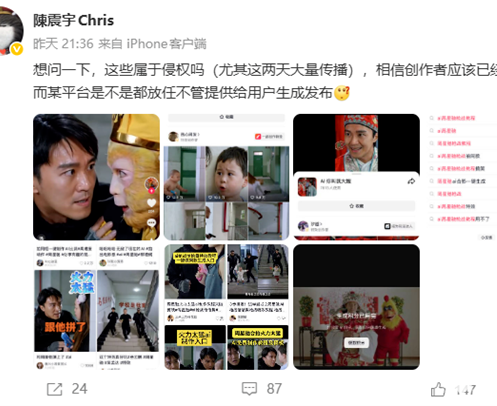 2026年2月11日消息,近日,大量AI生成周星驰经典电影片段的短视频在抖音平台广泛传播,部分内容被用于流量变现与商业推广,引发热议。随后,周星驰经纪人陈震宇在微博公开质问,此类行为是否已构成侵权。