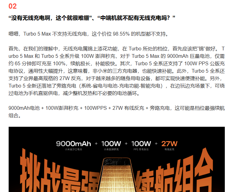 2026年2月5日,针对用户热议的REDMI Turbo 5 Max缺失无线充电问题,REDMI官方微博在网友问答环节作出正式回应,称该价位段98.55%的机型均不支持无线充电。